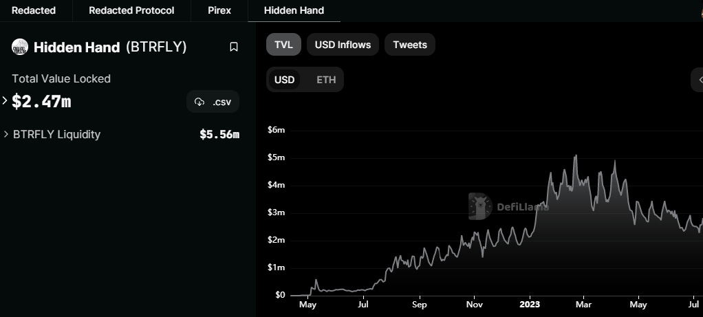 Another new implementation to Hidden Hand is the ability to view its stats and a brief overview along side the Redacted treasury tab, Pirex and the BTRFLY token on Defillama.com This page is a good resource to check the important stats for the health and activity of the Redacted product suite so head over and try it out.